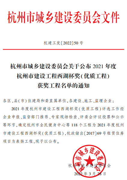 2022年3月,国丰大厦D座、杭州地铁6号线一期工程SG6-1-4标段等两个项目荣获2021年度杭州市建设工程西湖杯奖(优质工程)。