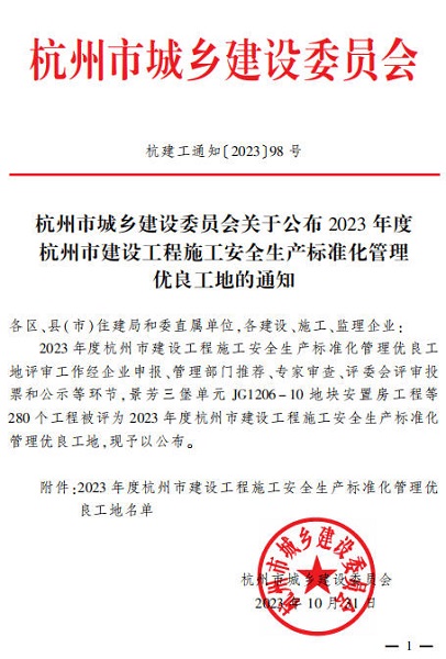 2023年10月,江干区笕桥职业高级中学、灯塔单元 XC0701-G1 / S42-04 地块公园绿地兼容社会停车场、双桥单元 XH0202-11 地块农居安置房、宁围街道新安村改善人居环境项目、萧政工出〔2019〕33 号萧山城区市北西单元 03-04-2-01 地块、新桥头、高桥、车家埭社区村级留用地项目、宁围街道宁牧村物业经营用房、杭州空港现代智慧物流产业园(一期)等8个项目荣获2023年度杭州市建设工程施工安全生产标准化管理优良工地。