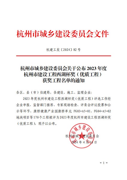 2024年4月,宁围街道新安村改善人居环境项目、双桥单元 XH0202-11 地块农居安置房、文一路(紫金港立交—荆长大道)提升改造工程绿化工程/文一西路(东西大道—荆长大道)提升改造工程道路两侧景观绿化设计采购施工(EPC)总承包项目等3个项目荣获2023年度杭州市建设工程西湖杯奖(优质工程)。