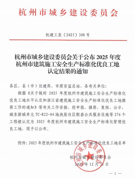 近日,杭州市城乡建设委员会正式公布2025年度杭州市建筑施工安全生产标准化管理优良工地名单,集团承建的浙江大学生命科学研究交叉中心等10个项目以过硬的施工管理水平斩获行业权威认可。
